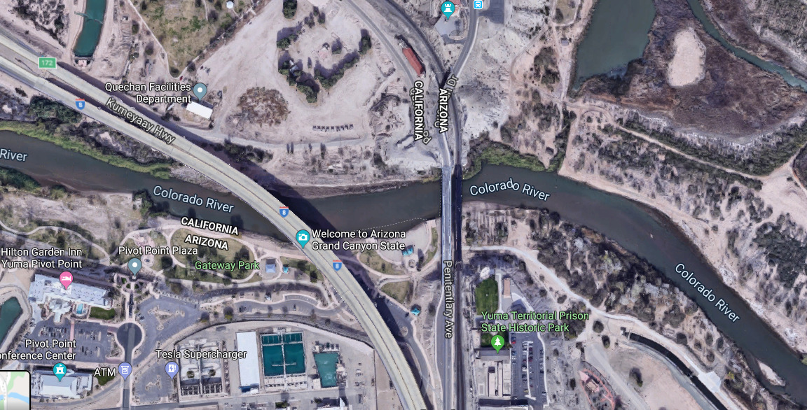 This bridge ended up being the “Ocean to Ocean” bridge, constructed in 1915, which crosses the Colorado River at the Arizona-California state line. It’s a narrow roadway that over time became both structurally at risk and also functionally obsolete, since it was bypassed in 1956 by a newer roadway nearby on 4th Avenue, and then again by Interstate 8 in the 1970s. Today it serves as a one-laner and carries a road called Penitentiary, named after the historic Territorial Prison State Park nearby. A railroad trestle bridge runs parallel to it.