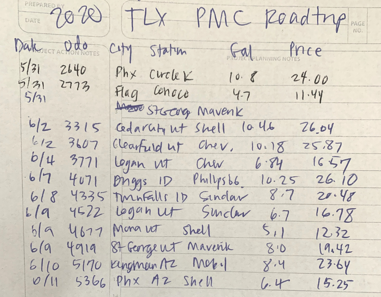 My return to Phoenix included a few more stops to see people as well as the aforementioned Fredrico’s Pizza delivery run. I made the most of each and every checkpoint along the drive home, even popping in to say hello to my friend Casey who works at the Shell gas station in small Mona, Utah off Interstate 15. My entire handwritten fuel log – or at least the 13 fuel stops since starting out in Phoenix – was left in the glove compartment for posterity.