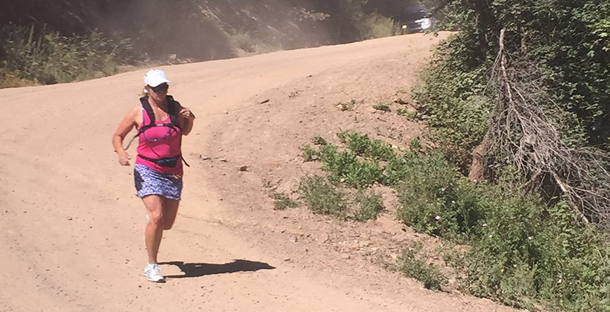Ready or not, I had a long way to go. But, as I’ve shared before, I compare a long-distance run to a long-distance drive: You just have to slice it up into manageable “chunks” and convince your brain that it’s achievable in small bites. So, in my case, I looked at the race as just running three miles. Over and over again. This year’s race was a family affair: Mom, stepmom, uncle, aunt, and cousin were all running it. The chances of (literally) running into ANY of them among 7,000 total runners was slim-to-none. But right before the biggest hill in the 26-mile stretch, the dreaded “Veyo Hill,” I saw my uncle Jeff and we chatted it up. We had car talk for a few minutes, until I panted and said, “You have a better pace than I do; go on ahead!” and he left me in a cloud of dust.