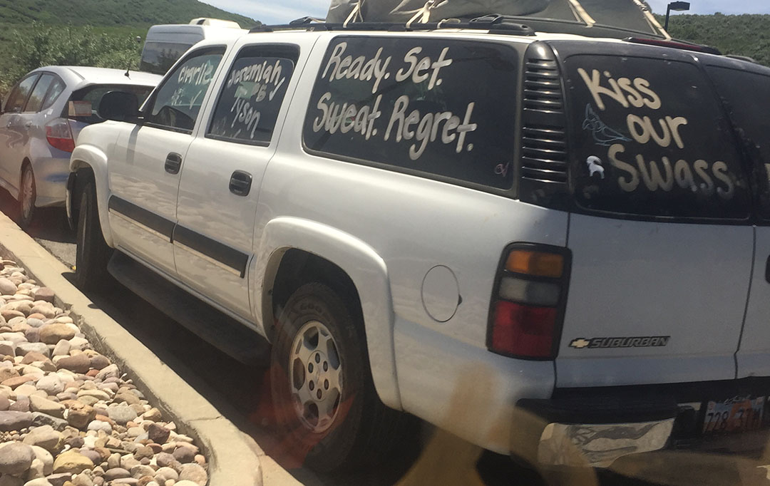 Decorating our rental Suburban with writing on the windows and our “Athens 2 Sparta” team name