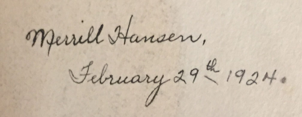 Merrill was a man who I wish I had gotten to know better – along with so many of my other ancestors. But one of the highlights of the past weekend in my home state of Utah was thumbing through a few of his books where he’d written messages inside the covers. One such example was this page from his Holy Bible. He was 21 years old and getting ready to depart for the “Eastern States Mission” for his church when he wrote this down on Friday, February 29th, 1924. Not a bad penman!