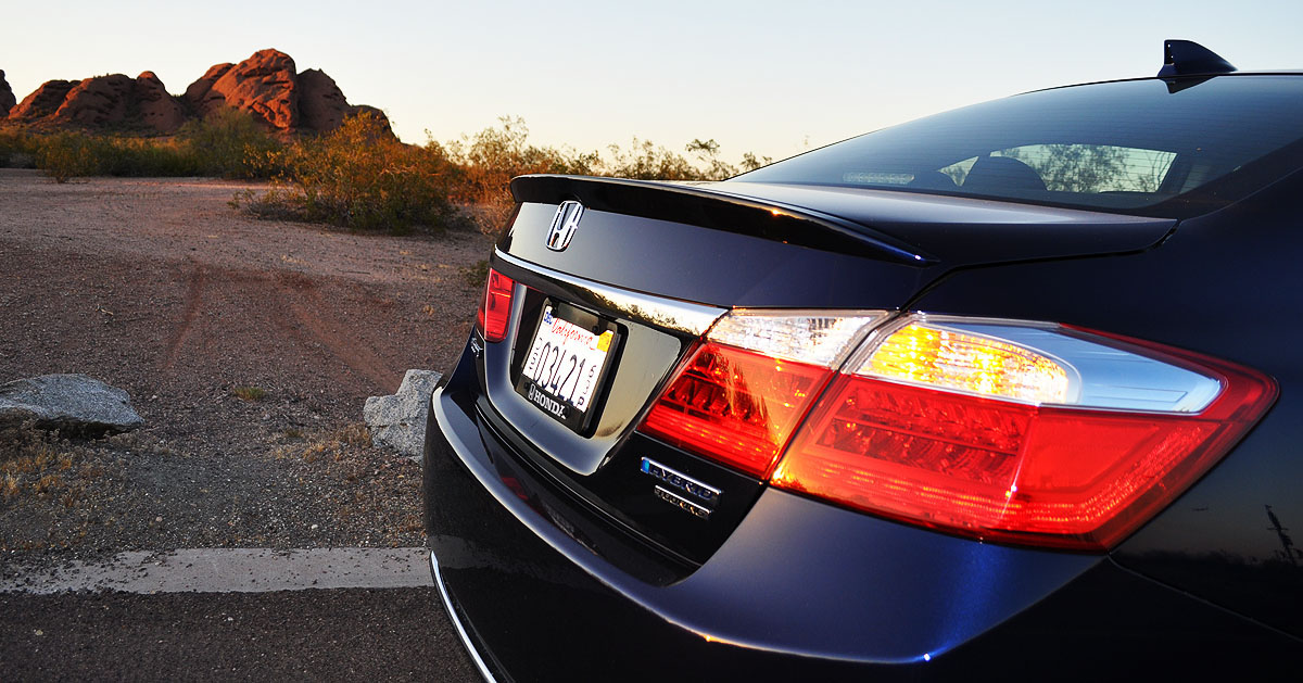 I mean, it’s an everyday Accord, right? Not supposed to “wow” anyone. This is Honda’s bread-and-butter sedan. Yet, this car is “handsome” from every angle. The new-for-2013 bodystyle carries on for 2014 and it’s easy on the eyes. Hybrid models get some special updates that I especially enjoy: blue accents in the headlights and fancy LED strips underneath them. A subtle lip spoiler rounds out the back end and LED taillights add an upscale look. Let’s talk about that paint color: Obsidian Blue Pearl. I’m a big fan, especially when the Arizona sun hits it just right.