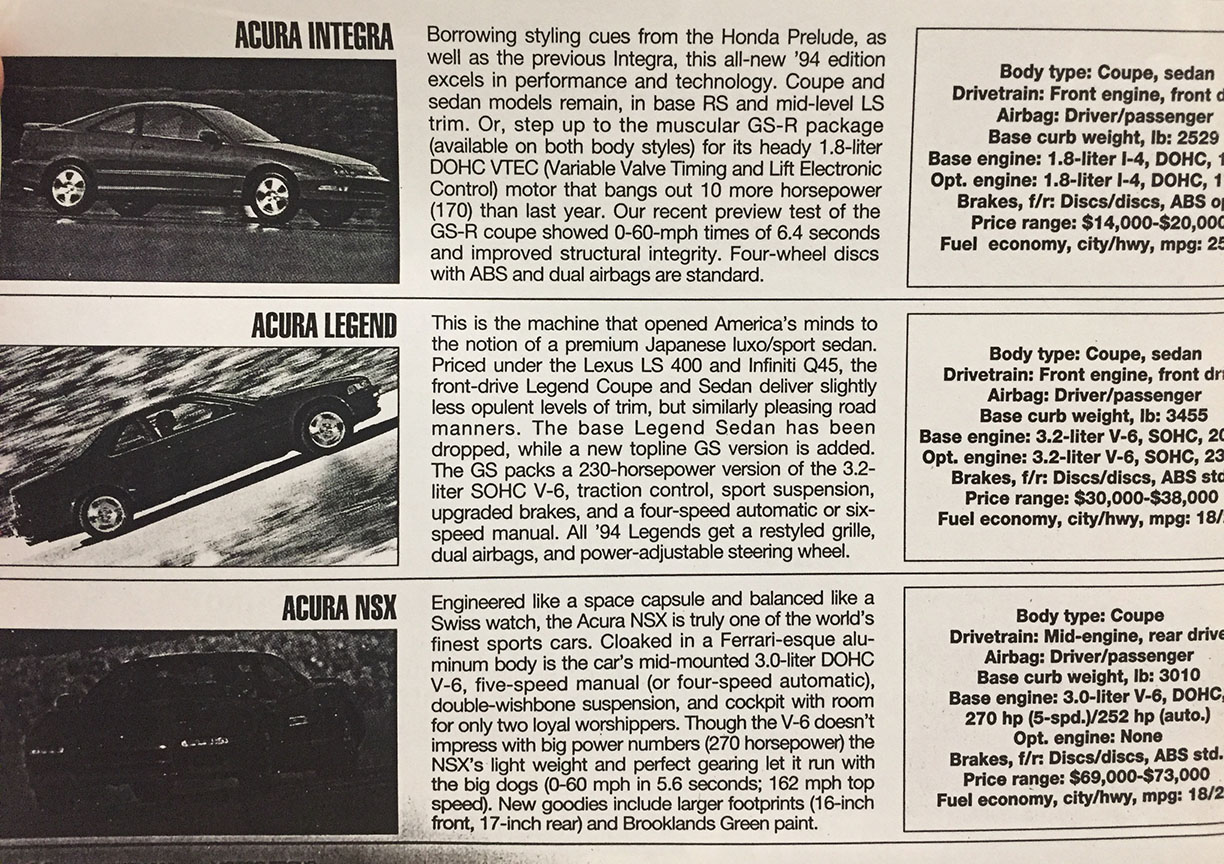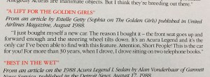 And finally, I was thumbing through a 30-year-old Acura brand magazine. There was an area where they highlight interesting news or reader submissions. Check out this paragraph about / by none other than Estelle Getty who played “Sophia” on Golden Girls.
