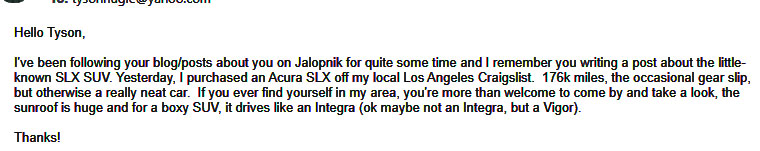 It’s rare for me to get on a plane, but somehow I still find a way to get my dose of high-mileage even when I do. My friend Matt picked me up from the Salt Lake City airport last Friday in a 333,000 mile Honda Pilot. Now that’s my kind of shuttle.